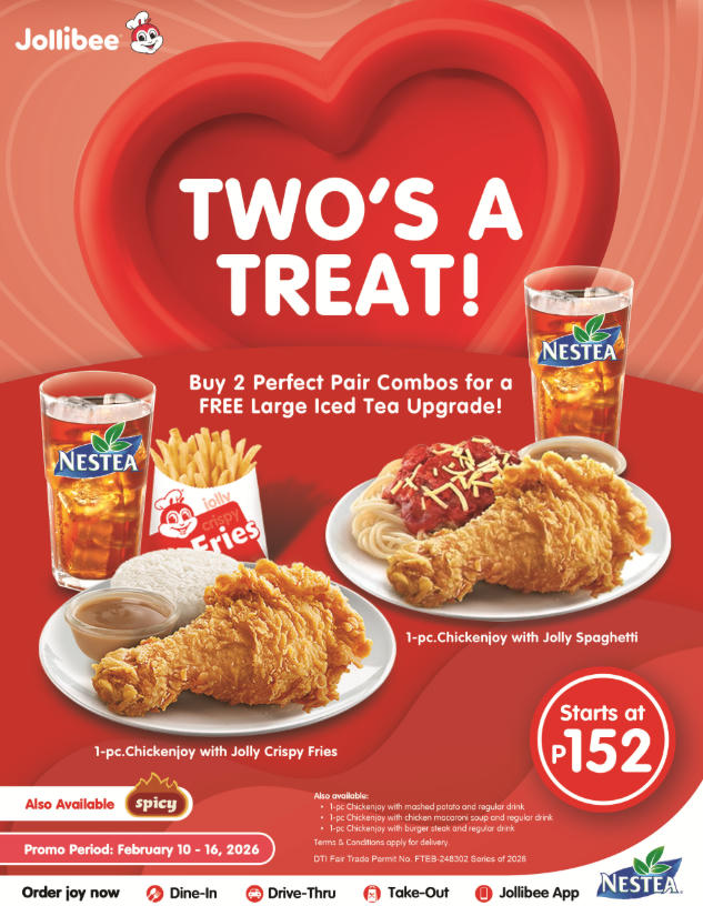 The Perfect Pair Combos let customers pair their favorite Jollibee meals, including 1-piece Chickenjoy with regular fries and iced tea, 1-piece Chickenjoy with spaghetti and iced tea, 1-piece Chickenjoy with mashed potato and iced tea, 1-piece Chickenjoy with chicken macaroni soup and iced tea, and 1-piece Chickenjoy with burger steak and iced tea. Any combination of two Value Meals comes with a free large iced tea upgrade. Starting at just ₱152, the Perfect Pair Combos are available for dine-in, takeout, drive-thru, and delivery, making it easy to share love and joy this Valentine’s season.
