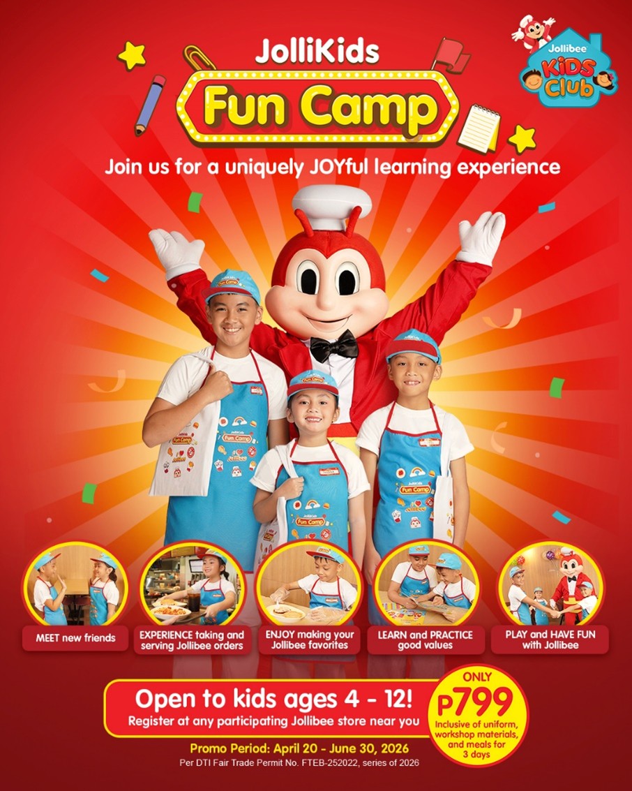 Registration is set at P799 per participant, inclusive of a camp apron, cap, tote bag, a Jollibee Values Book, workshop materials, and meals for the three-day program. Interested parents may register through participating stores or visit